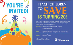 The 2018 Teach Children to Save Day is exactly onemonth away and will be celebrating its 20th birthday! Teach Children to Save Day is a free national program sponsored by the ABA Foundation, and was started in 1977 to coordinate bank volunteers in helping young people develop a savings habit early in life.